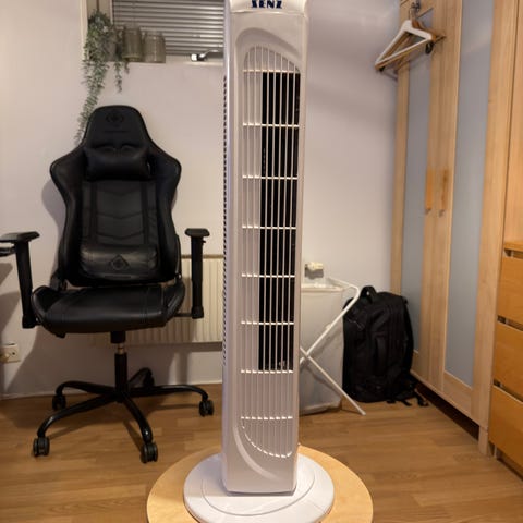 Den visar temperatur i rummet (se bild), har fyra fläktar och roterar för att sprida luften. Enkel kontrollpanel ovanpå (kontrollen gick i sönder därför medföljer den ej).