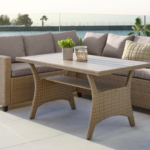 Utegrupp med soffa, två fåtöljer och bord i trä och rep, grå dynor