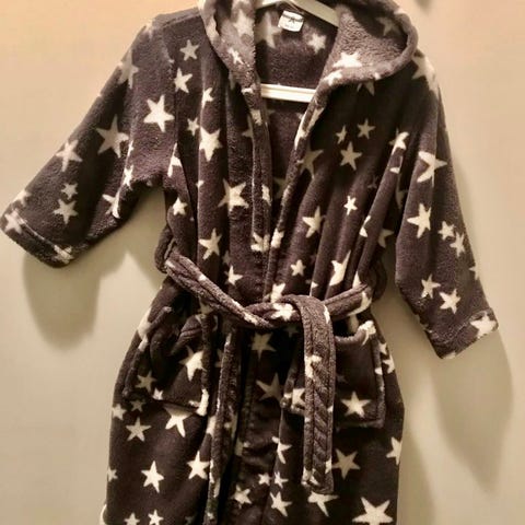 Blå morgonrock från Name it i stl 92 med huva och Spiderman-märke fram. Har knytskärp i midjan, fickor och spindelnätsbroderi på huvan.