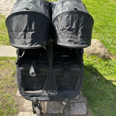 Baby Jogger City Mini syskonvagn i svart med två separata sittdelar. Justerbara selar, varukorg under och suffletter över varje sittdel. Fyra extra hjul följer med.
