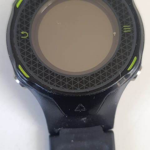Garmin Forerunner 920XT sportklocka med rött armband och fyrkantig display. Har flera knappar runt boetten och laddas via USB-kabel.