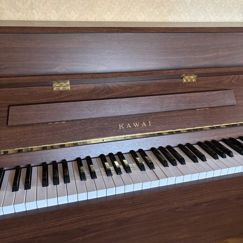 Svart piano från Wagner med tre pedaler och hel klaviatur. Klassisk rak modell med dekorerade ben och lock över tangenterna.