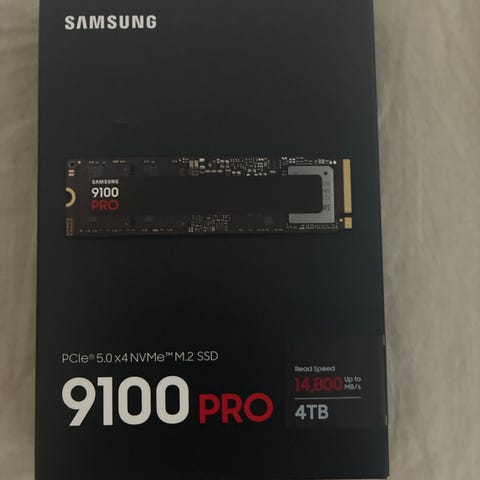 Oöppnad Samsung 990 EVO Plus NVMe M.2 SSD med 2TB lagring säljes. Originalkartong med info om läshastighet och övriga specifikationer på baksidan.