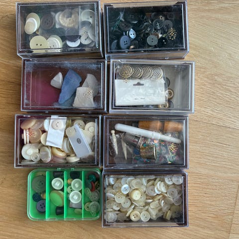 Sykit med olika färger på tråd och garn samt flera askar med knappar. Allt ligger samlat i en plastlåda, smidigt för den som gillar att sy eller fixa kläder.