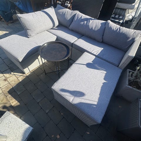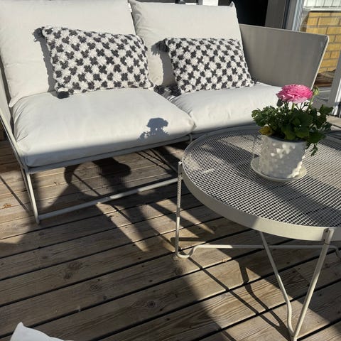 Hörnssoffa för uteplats, creme/beige med vattenavvisande tyg.