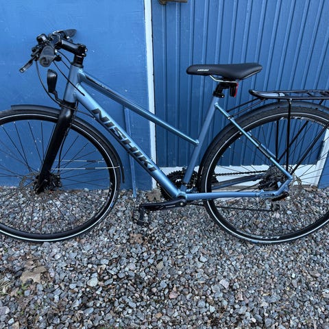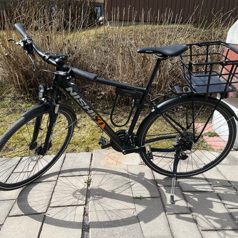 Utrustad med raka styren. Hydrauliska skivbromsar fram, pakethållare bak och Shimano-vevparti.