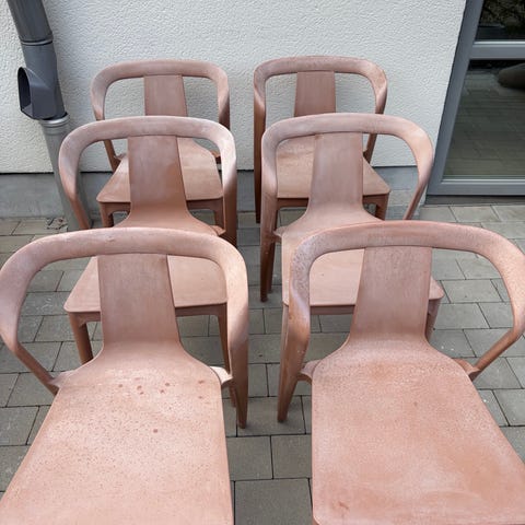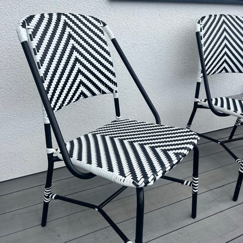 6 stycken Flätade utestolar med grå sittdyna och svarta ben. Skön som matstol till utebord eller på altanen/balkongen.