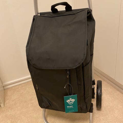 Svart dramatenvagn från Epic i tåligt tyg. Har lock med spänne och flera fack samt rejäla hjul och handtag.