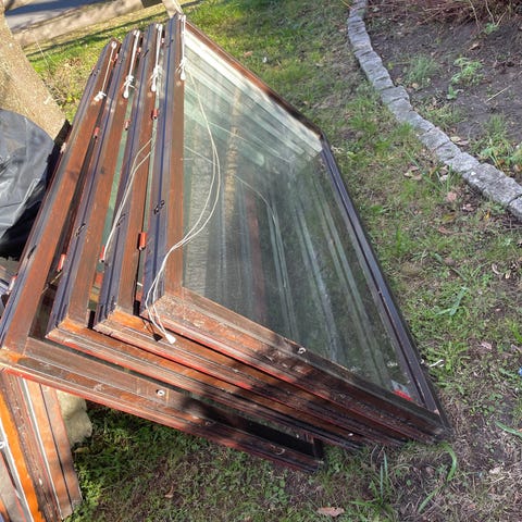 Ett gäng äldre fönster i varierande storlek och skick skänkes.