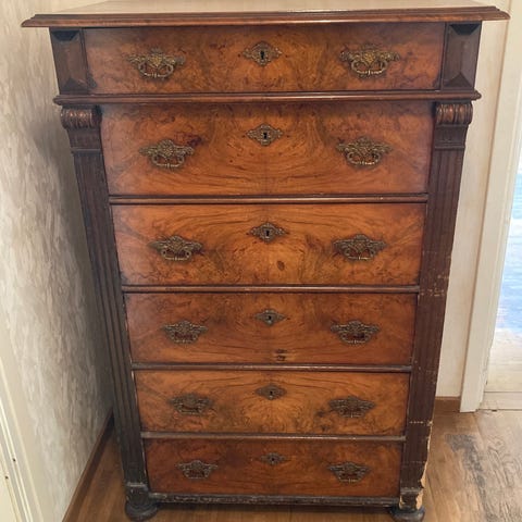 Gammal byrå,tillverkad i Kyrkhult av en Justus Svensson Mars 1924.Alla beslag är orginal,fattas dock nycklar.