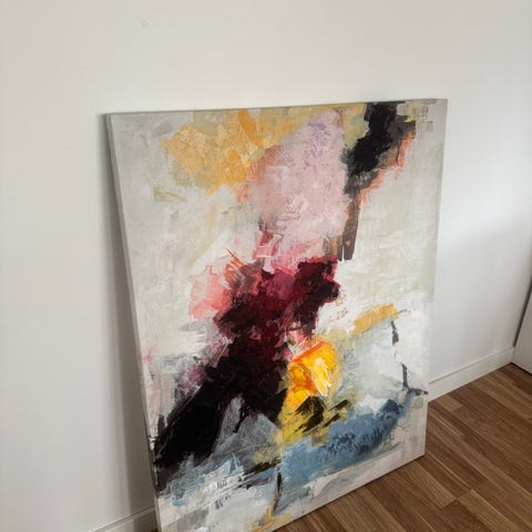 Stor abstrakt tavla i blått och vitt med lila i detaljerna. Målad på duk med struktur och mjuka, svepande penseldrag. Gunilla Dahl. Mått 152*112 cm. Vit ram i trä. Duken trasig på ett ställe men lagad, inget som syns nämnvärt.