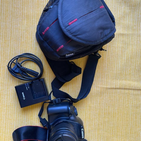 Canon digital systemkamera med EF-S 15–85mm zoomobjektiv och kamerarem. Batteriladdare, kameraväska och ett extra original linslock ingår. Minneskort 32GB Kingston ingår också.