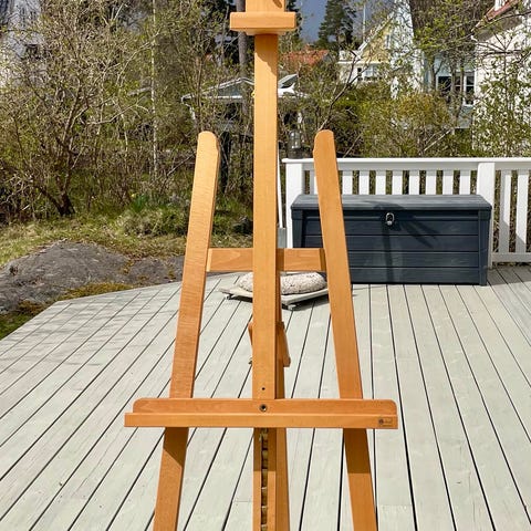 Bordstaffli Varde i trä, justerbart med skruv framtill. Stabil fot med kant som håller målarduken på plats. Har använts få gånger. Säljes pga att den ej kommer till användning längre.