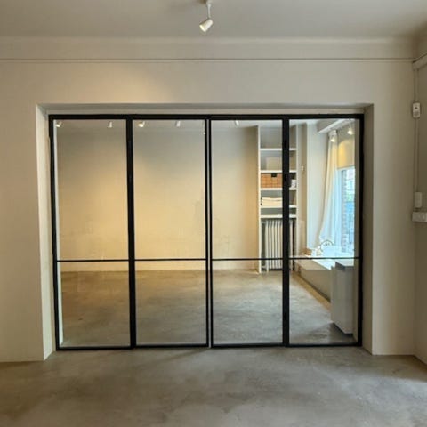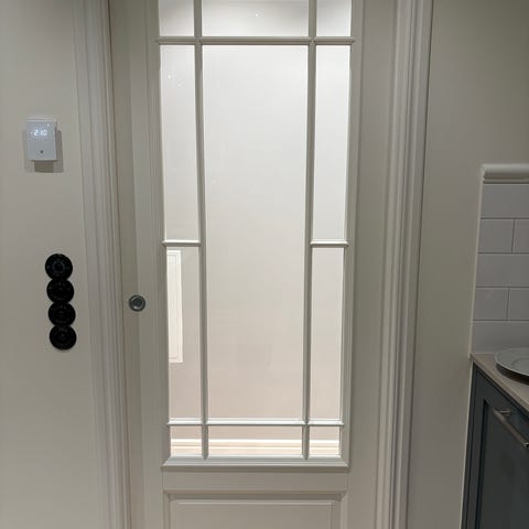 Vita skjutdörrar med spröjsade glasrutor, passar bra som rumsavdelare mellan två rum. Skena upptill ingår i lösningen och dörrarna har handtag i mitten för enkel öppning och stängning.