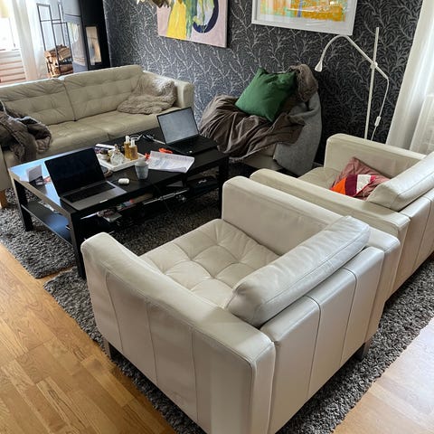 Fungerar men är i slitet skick. Ena armstödet på ena fåtöljen vingligt. Tresits soffa.