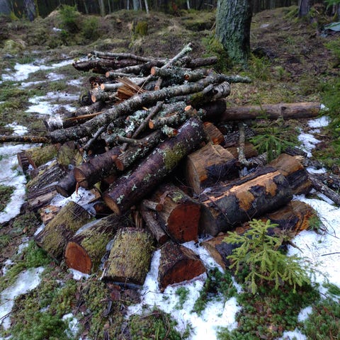 Blandad ved och grövre stockar i olika längder och tjocklekar. Ligger staplat i en hög ute på tomten, en del under presenning och plåtar. Har legat några år, så oklart energivärde.