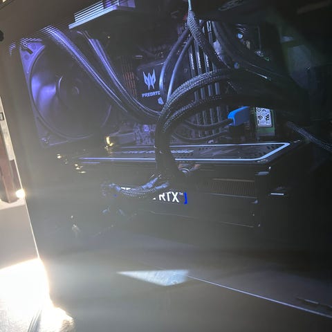 cer Predator stationär dator med belysning. Datorn är designad för spel och hög prestanda. Den har ett robust chassi med LED-ljus och flera anslutningsmöjligheter. Passar för användare som behöver en kraftfull dator för spel eller krävande applikationer.