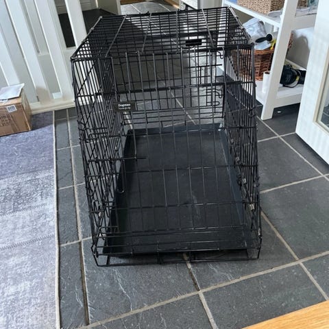 Hundbur SafeCrate för mellanstor hund. Funkar som den ska, visst slitage och gnagmärken i bakkant. Dyna medföljer.