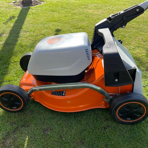 Stihl gräsklippare i orange och vitt med uppsamlare. Justerbart handtag och hjul som gör den lätt att köra på gräsmattan.