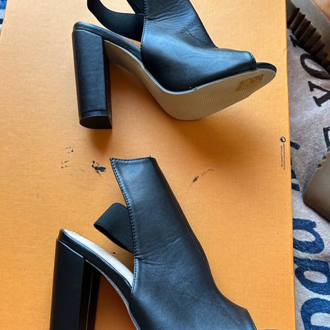 Svarta klackskor från ONLY i stl 39 med bred rem över tån. Har ankelrem med spänne och hög blockklack.