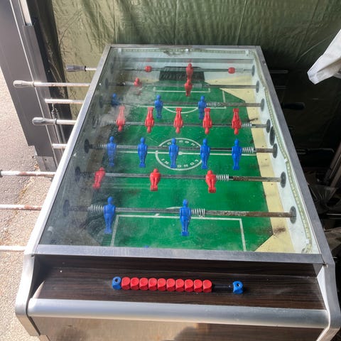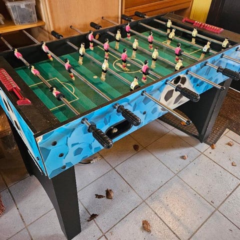Stabilt bordfotbollspel i svart med grönt spelplan och spelare i två lag. Har rejäla ben, kromade stänger och handtag på sidornaÄr