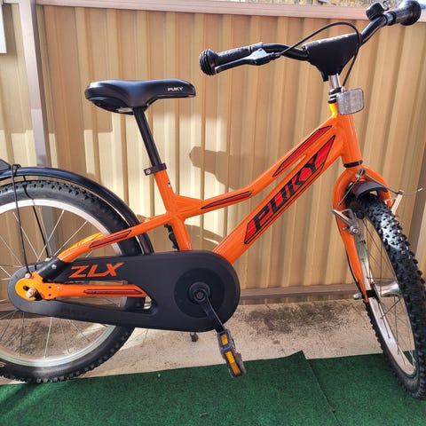 Svart barncykel från pinepeak med 18" hjul och kedjeskydd med mönster. Utrustad med skärmar, reflexer och handbroms fram.