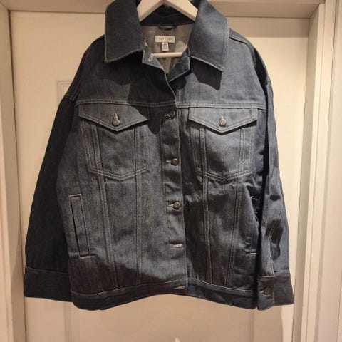 Svart jeans jacka med krage, knappar framtill och fickor på bröstet och sidorna.