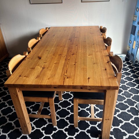 Matbord från IKEA i trä med kraftiga ben och två skivor. Sex grå, stoppade stolar med knappar i ryggen och nitar längs kanterna ingår runt bordet.