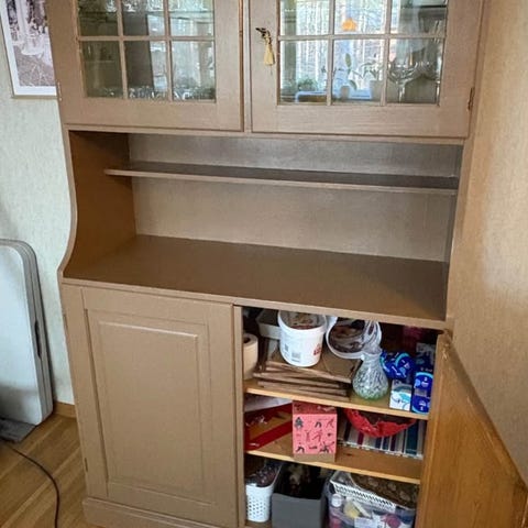 Hyllor och skåpdörrar finns till.