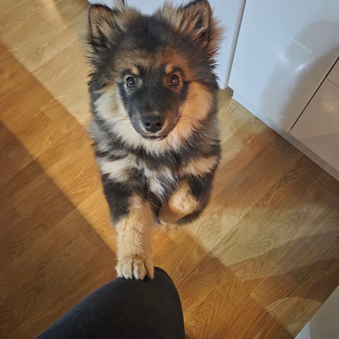 Valpen är en blandning av lapsk vallhund, svensk lapphund och en mindre del border collie. Hon är social, nyfiken och växer upp i en trygg miljö med mycket närhet och omvårdnad.