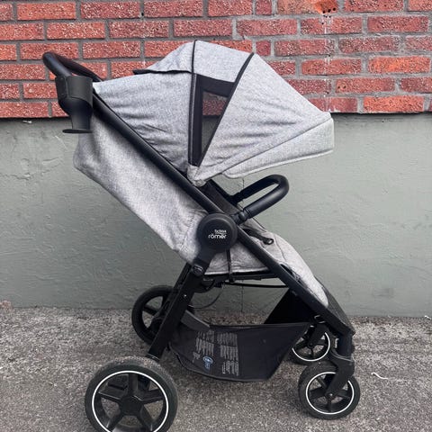 Britax sulkyvagn i grått tyg med svart chassi. Har varukorg under, justerbart ryggstöd och sele i sittdelen. Enkel och smidig att fälla ihop.