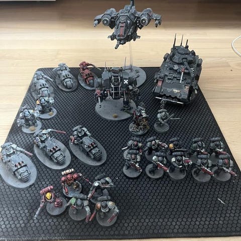Proxy (alltså EJ original) Tau-armé med flera infanterimodeller, drönare och en större stridsvagn, allt målat i röd färgsättning. Alla figurer är printade.