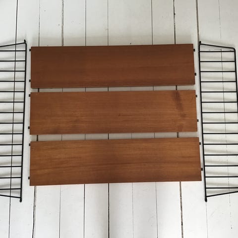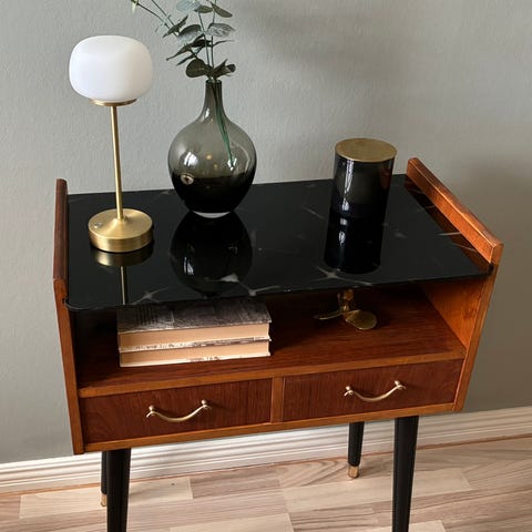 Säng- eller hallbord från 50-tal eller 60-tal. Befintliga, 3 st, tassar är spruckna och den fjärde saknas. Låda är något trög att stänga.