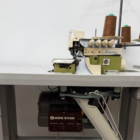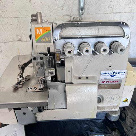 Butterfly industrisymaskin/overlock i grön metall med separat vit motor, 220V. Har sidobord i metall och flera reglage och skruvar för att justera sömmen.