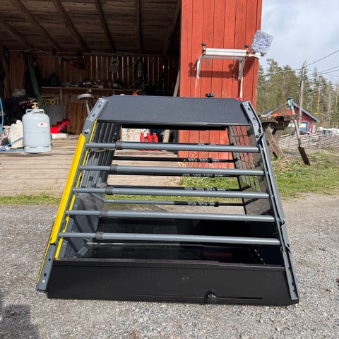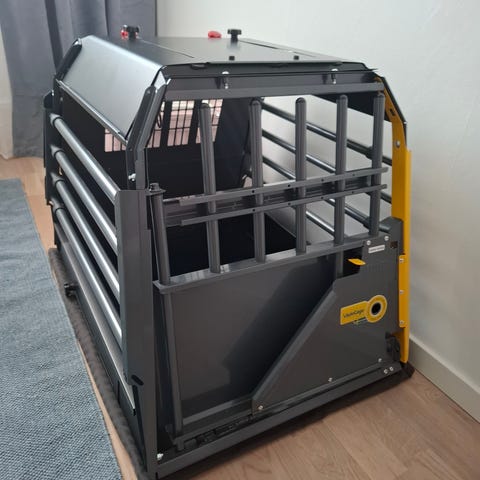 Hundbur i mycket fint skick säljes. Dubbla dörrar, storlek medium. Mått; 76-103 x 93 x 65cm. Nypris 7500.