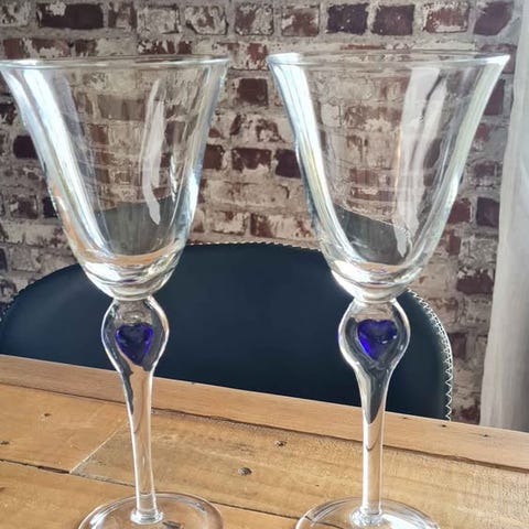 Slankt kristallglas med ett dekorativt dubbelt hjärta i frostat glas på stjälken