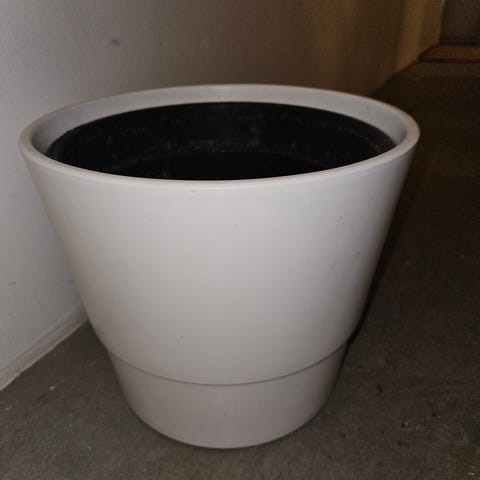 Vit kruka med fat i keramik/porlin, med hål i botten. Enkel modell som passar bra till större växter inomhus.