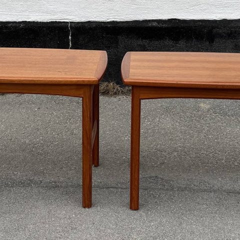 Säljer ett par klassiska skandinaviska retro-sidobord (ofta kallade "plekterbord" eller trekantbord på grund av sin form) från 1950- eller 1960-talet. Modellen påminner mycket om dansk design, exempelvis bord av Kurt Østervig för Jason Møbler, men liknande modeller tillverkades även av svenska och norska möbelfabriker.