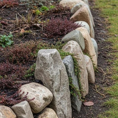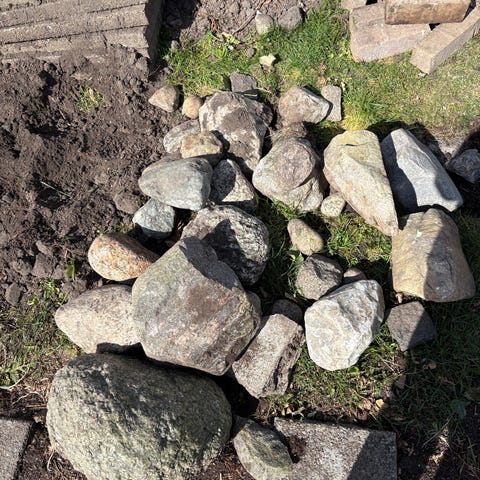 Hög med natursten/sprängsten i blandade storlekar. Fungerar bra till exempelvis mur, kantsten eller trädgårdsprojekt.