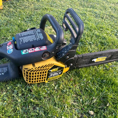 Bensindriven Texas Power motorsåg med Oregon Double Guard 91-svärd. Gul kåpa, fram- och bakhandtag i svart samt enkel åtkomst till reglage och tanklock.