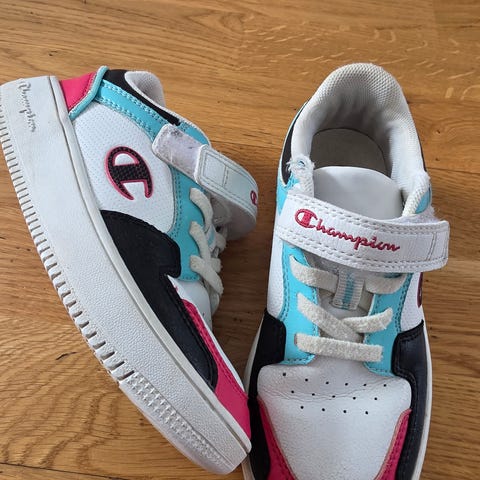 Champion sneakers i stl 31 för flicka, rosa med gröna detaljer och snörning. Lätta och mjuka med mönstrad sula som ger bra grepp.