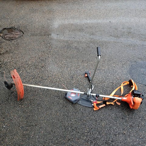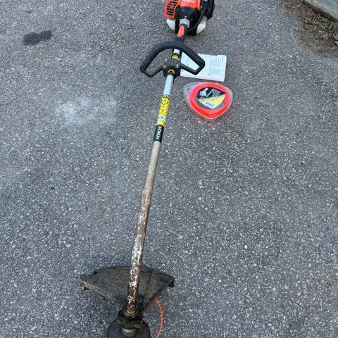Tanaka grästrimmer/röjsåg med bensinmotor och långt skaft. Har loophandtag och trådhuvud för att trimma gräs runt kanter och rabatter.