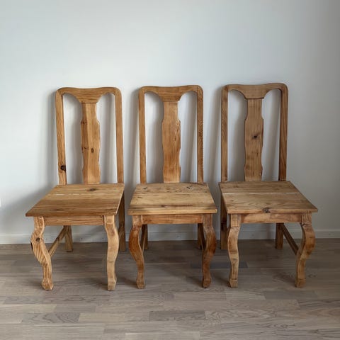 Säljer 6 st stabila och gedigna trästolar i rustik/lantlig stil.
