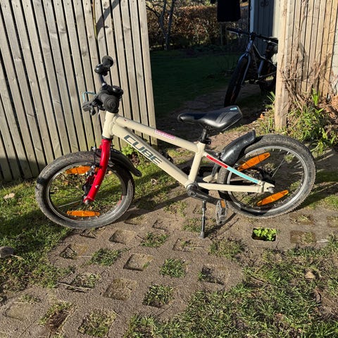 Rosa barncykel från Cube med 16" hjul. Utrustad med skärmar, stöd och handbromsar fram och bak.