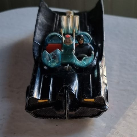 Liten Wonder Woman-bil från Corgi i orange med tryck på huven. Metallchassi märkt Made in Gt. Britain och DC Comics 1979, rullar fint på fyra hjul.