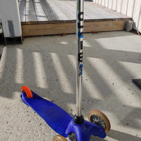 Blå sparkcykel från Micro med tre hjul. Justerbart styre och fotplatta med räfflor för bättre grepp.