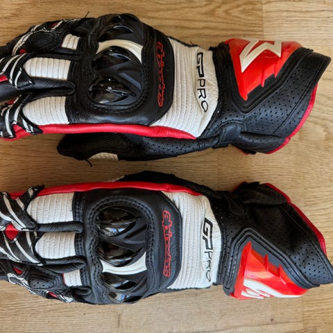 Extremt sköna handskar som har körts med på bana ett fåtal gånger. Något missfärgade på det röda partiet pga mjuka handtag (se bild).