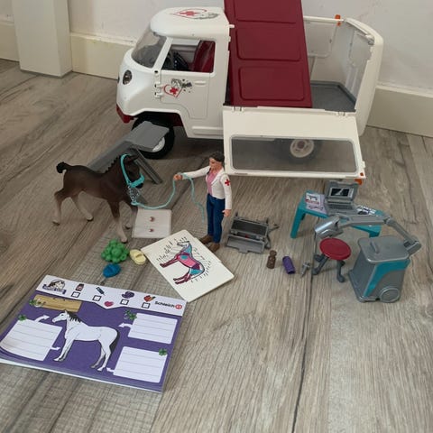 Fullständig Schleich ridcenter med ryttare och hästar, alla originaltillbehör finns med och är i fint skick. Enbart lite tecken på användning på hästarna.