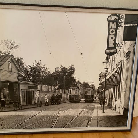Litografi med bussmotiv i ram