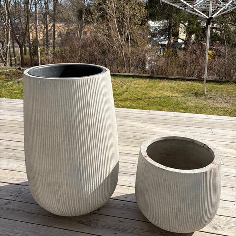 Två blå ytterkrukor med ljus insida och enkel dekor på sidorna. Passar bra för blommor eller mindre buskar på altan eller i trädgård.